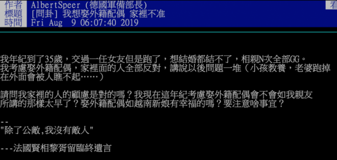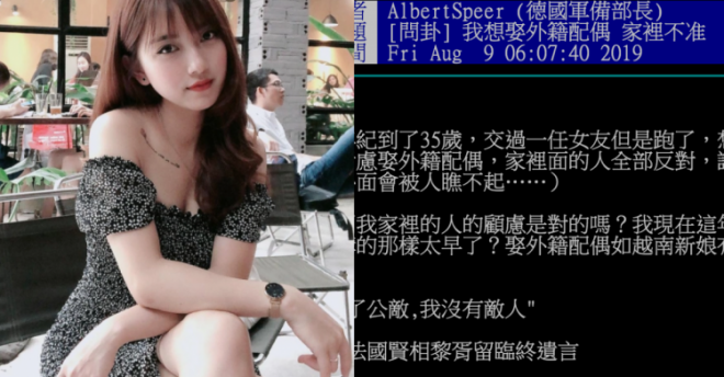 「娶外配真的是下下策,看到太多越配在台灣外遇了」