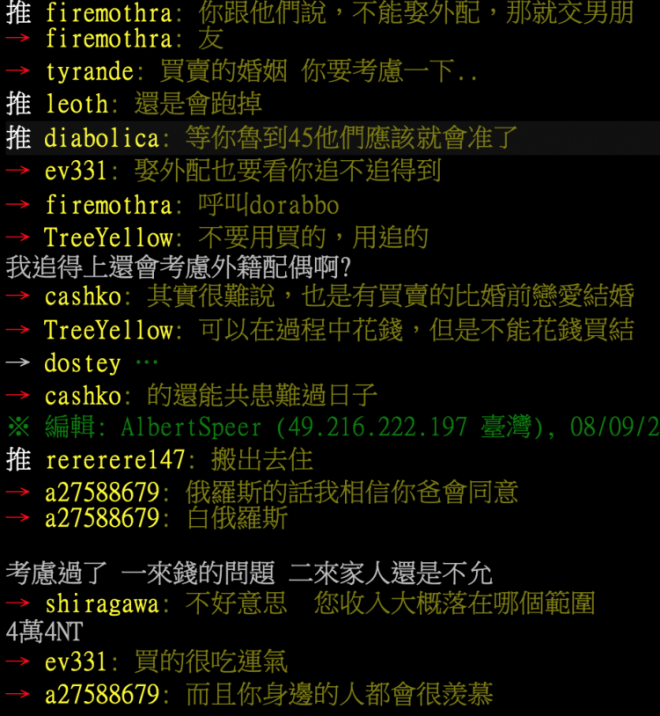 文章一出,引發鄉民熱烈討論,紛紛留言表示「買賣的婚姻,你要考慮一下」