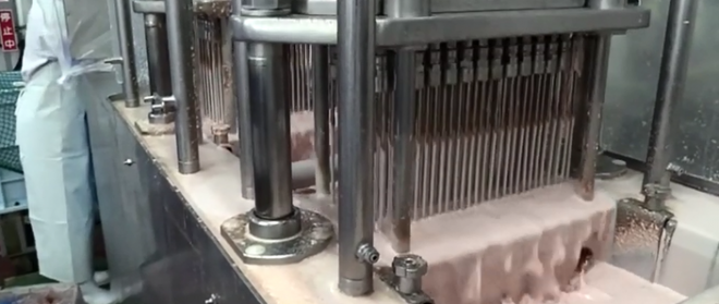 這是製造注脂牛肉的過程。業者用帶有100多支針頭的機器,向牛肉中注入白色牛油和調味料。