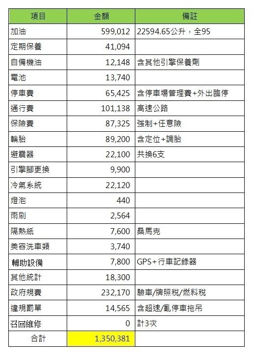 總結算為了養這台車,原Po共花了135萬,幾乎是購入車價的2倍,平均一年剛好10萬出頭。
