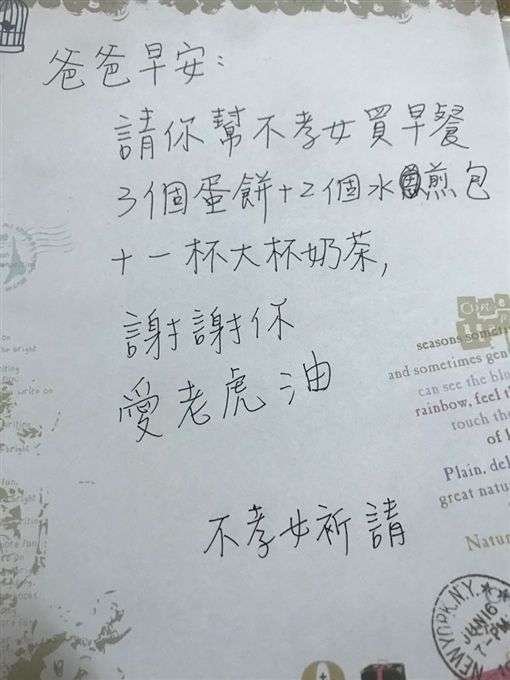 隔天寫紙條給爸爸說「請幫不肖女買早餐」,