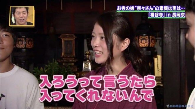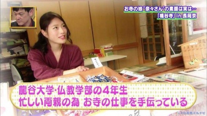 日本電視節目採訪到一位龍谷大學法學部4年級的美女女大生,由於父母工作忙,平時都會在寺院裡幫忙。