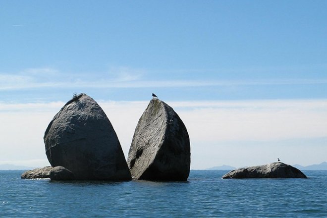 巨岩:位於紐西蘭的這棵被切兩半的大石頭是著名觀光景點,它是被雨和海浪自然侵蝕而成的。