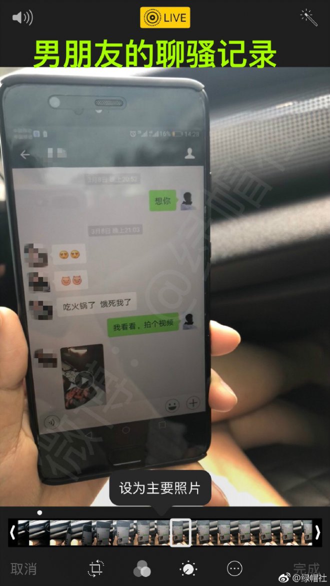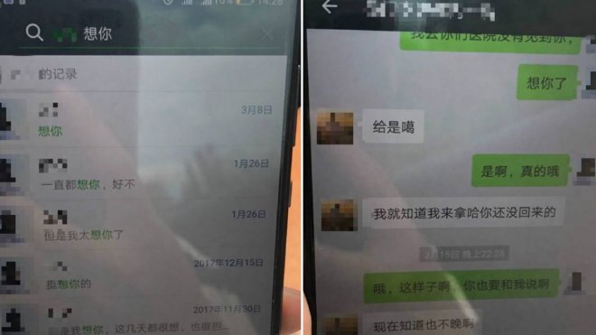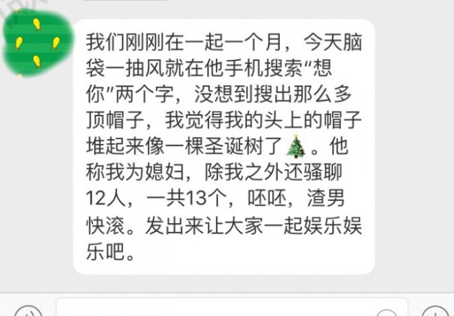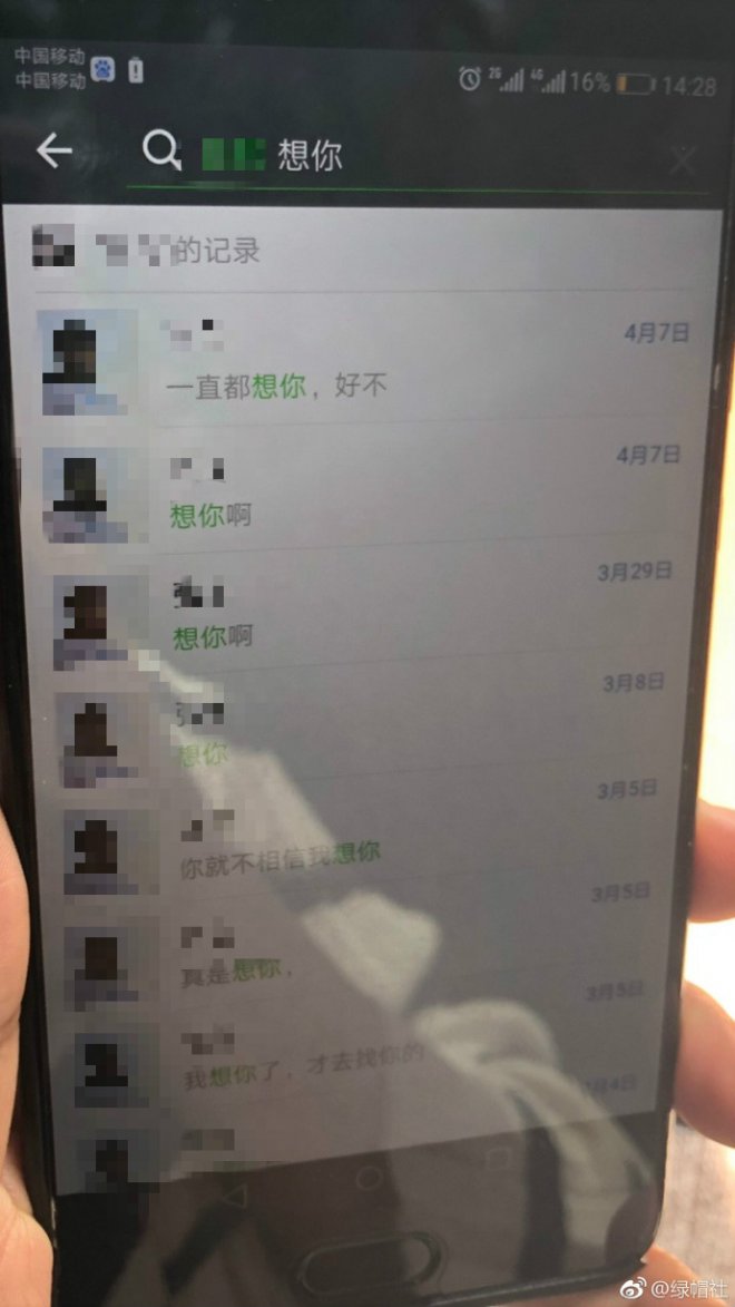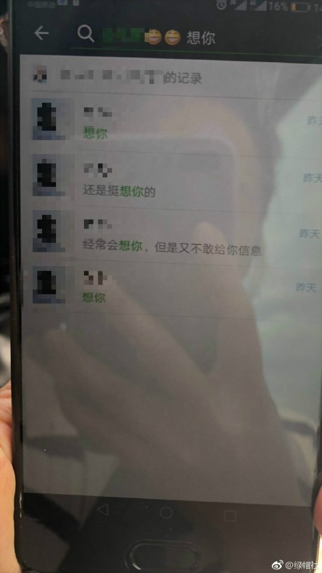 女網友在微博「綠帽社」發文,表示自己無聊在男友手機搜尋「想你」兩個字,沒想到竟搜出多頂「綠帽」,她PO出男友和其他女生聊天的截圖,從對話紀錄中可以看到,男方經常對其他女生表示:「我想妳,多想陪妳」、「一直都想妳」、「但是我太想妳了」、「我想妳,這幾天都很想」、「經常會想妳,但是又不敢給妳信息」,這些曖昧對話在兩人交往後一直持續,且最近一次的紀錄就在昨天,讓原PO 不禁感嘆男友平時喊她「媳婦」,私底下卻是這種人。