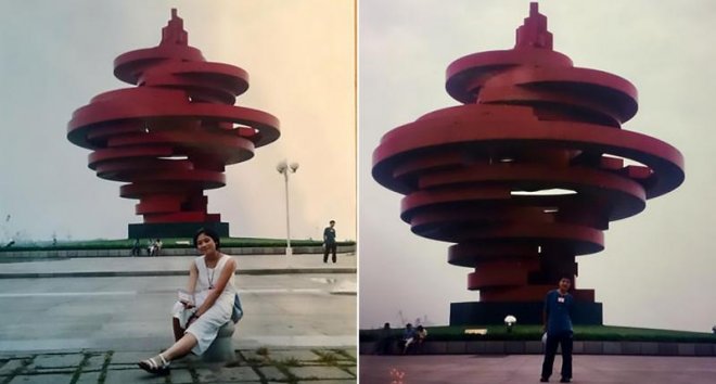 隨 後,妻子看到這張照片後也是倍感驚訝,直呼不可思議!原來,17年前的當天,她陪著自己的媽媽來到青島看病,順便到代表性的建築「五四廣場」拍下了這張照 片,而當天,丈夫也恰好從外地來到青島打工,初到青島的他經過五四廣場,也順便拍照留念。沒想到,兩人早在17年前,就曾「同框」過了。
