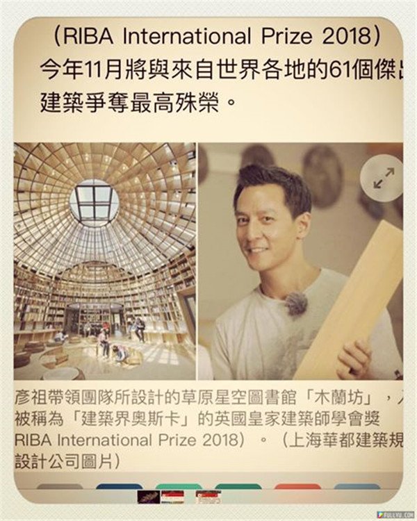不只帥!吳彥祖親手打造超唯美「草原星空圖書館」,入圍「建築界奧斯卡獎」夜晚美爆!        	建築        	人物        	創意        男神吳彥祖有迷人的優越外貌,在演藝圈有亮點的表現,從美國奧勒岡大學建築學系畢業的他在建築設計上也非常有才華,近日他參加大陸綜藝《漂亮的房子》設計的作品,入圍了有「建築界奧斯卡獎」之稱的英國皇家建築師學會獎(RIBA International Prize 2018)。