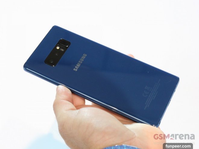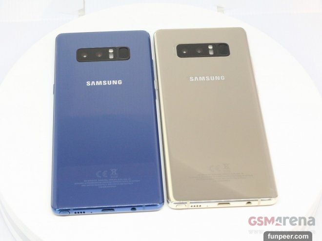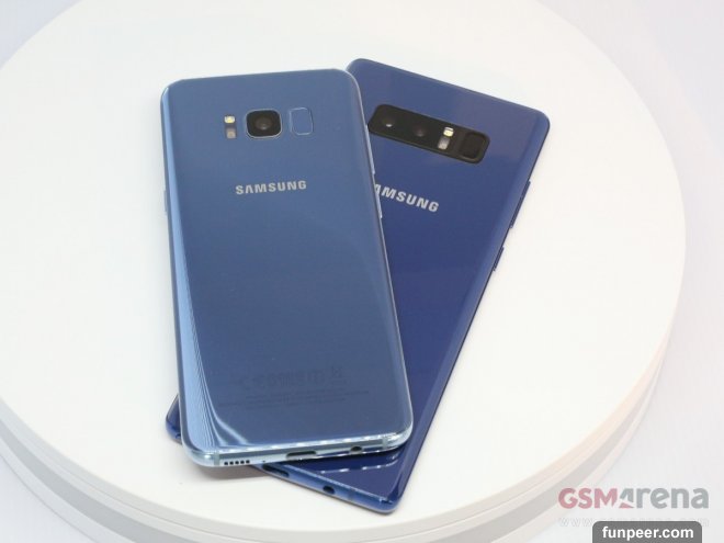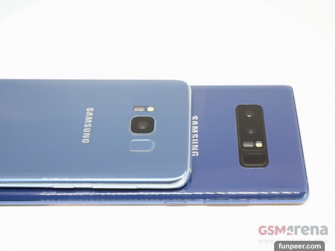 顏色部分,為了與Galaxy S7與S8的珊瑚藍色作出區別,Note8推出新色「深海藍」,它的顏色較深,不像珊瑚藍那麼亮。下方是珊瑚藍的S8與深海藍的Note8。