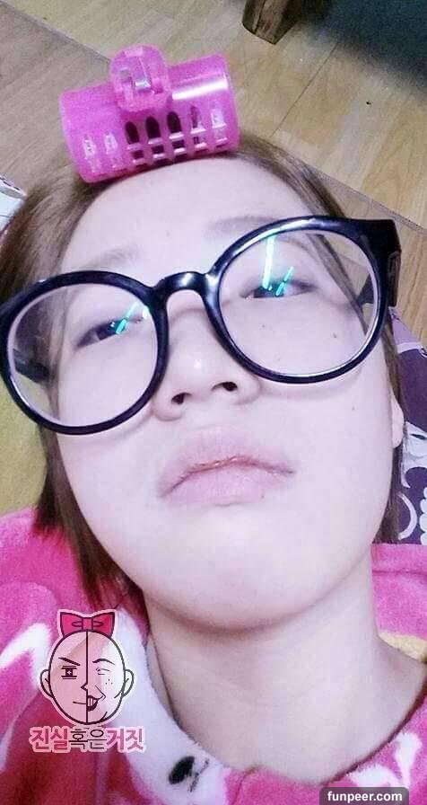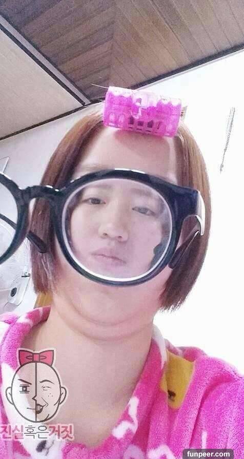 她滿臉無神地帶著一副老土的眼睛,頭髮上還有髮夾。還用各種不同的角度把自己拍出