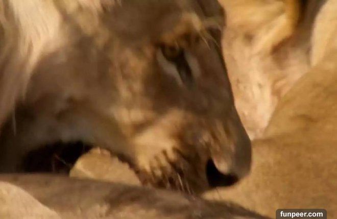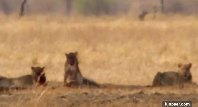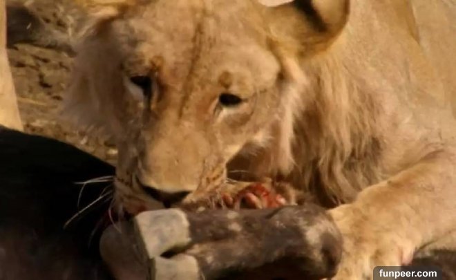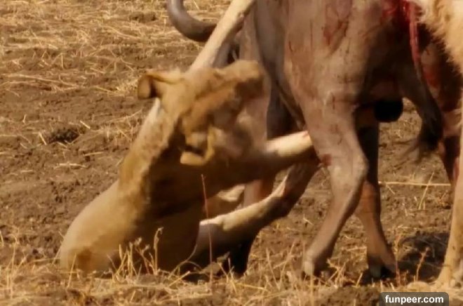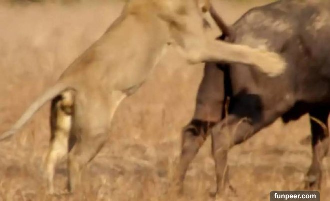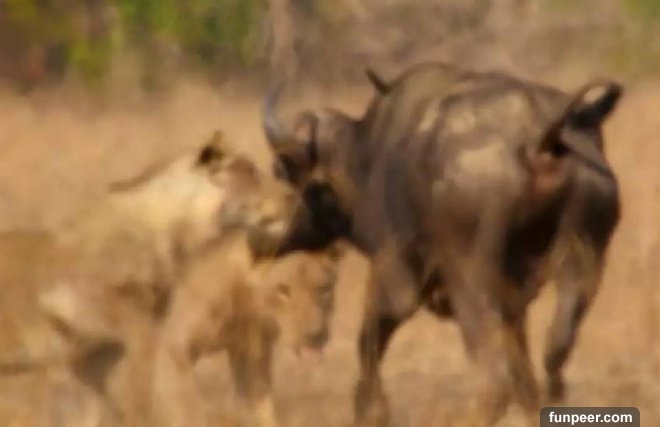三隻獅子一起攻擊、終於把公牛摔倒在地,整段戰鬥持續了二十分鐘,三隻獅子已經筋疲力盡了,它們已經忍不住撕碎獵物的心了。