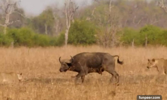 公牛發狂似地用利角攻擊獅群,看起來效果相當顯著....