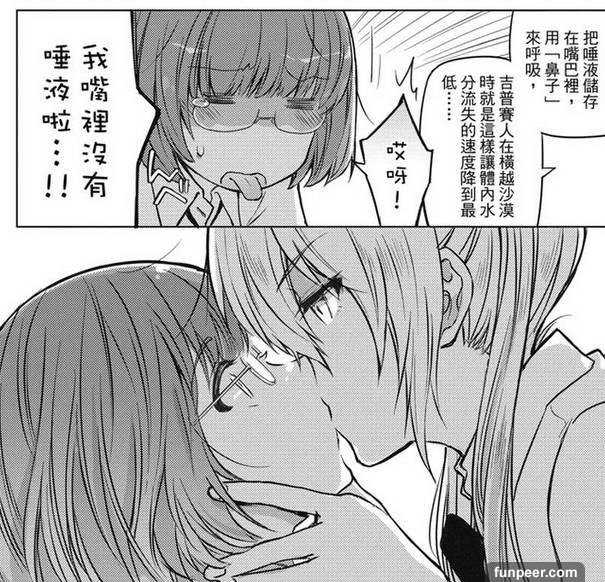 还不忘加上各种恶趣味。比如作者在故事里说,人体降低水分流失的方法是在嘴里含着唾液,然后用鼻子来呼吸。可嘴里没唾液啊?没事,妹子用嘴分你一点——