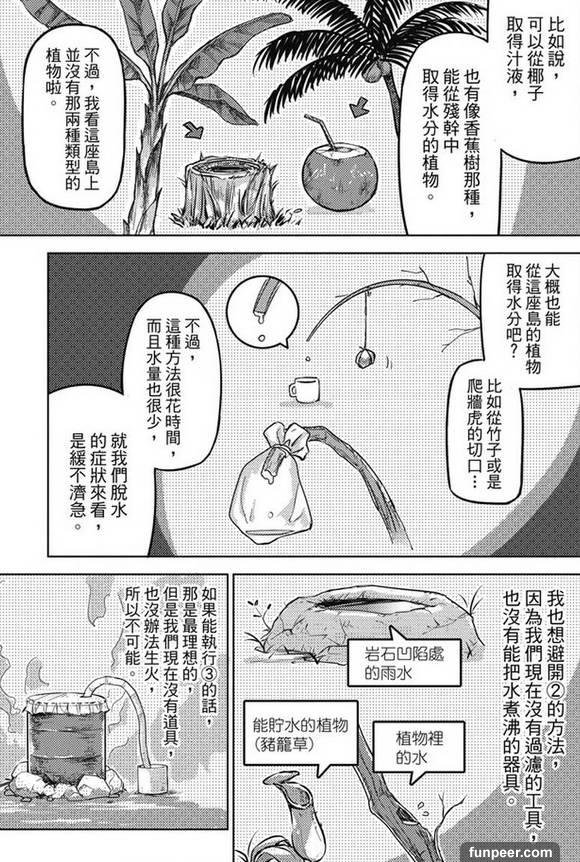 哎呀,我去,听着都没食欲了。妹子你当年是被你爹如何摧残才活下来的啊?总而言之,这个故事就是描述这四个妹子在荒岛上表演一幕幕的求生手段。她们从如何建房子、抓动物,再到后面放狼烟来吸引过往船只的注意等等,她们就这样一点一点活了下来。这个故事有意思的地方就是五花八门的求生知识,比如各种获取水源的方法——