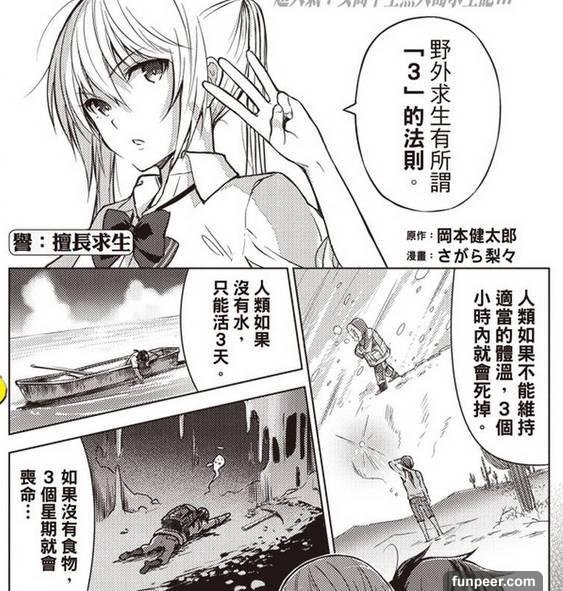 这妹子堪称是贝爷性转,求生可是她的特技哦。不过嘛,如果你看过贝爷的《荒野求生》就知道,求生姿势一般都是......很拉风哒!(废话,能活命就行啦)这故事中的女主也不例外,她的求生技能把小伙伴们都给惊呆了。比如在被救上之后,她被渴醒了,四周也没有淡水(亲,海水是不能喝的哦),怎么办呢?只见妹子挥棍就敲晕了一只飞鱼——