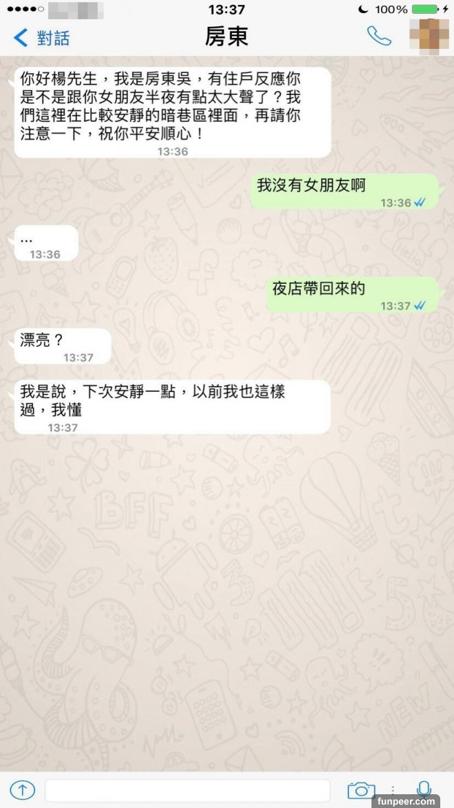 ,要他和女友愛愛時小聲點,「我是房東吳,有住戶反應你是不是跟你女朋友半夜有點太大聲了?我們這裡在比較安靜的暗巷區裡面,再請你注意一下,祝你平安順心!」