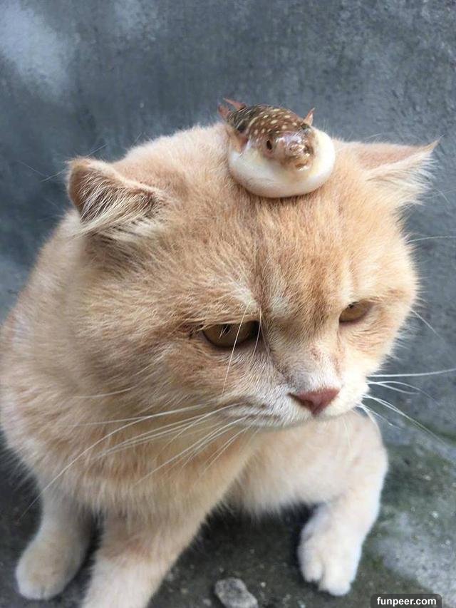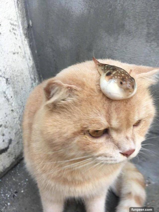 把河豚放在喵星人頭上,以為牠會甩頭反抗!結果竟「氣成河豚臉」網友看了全笑噴!!