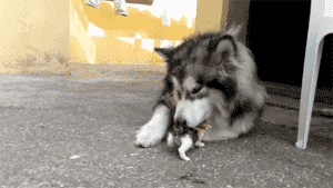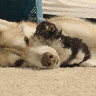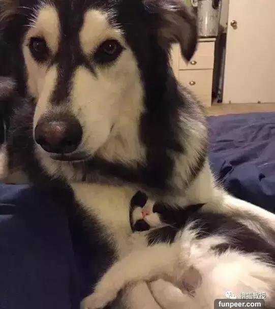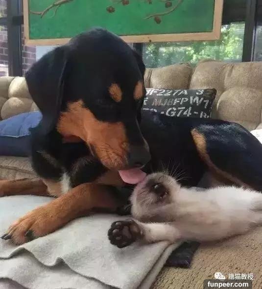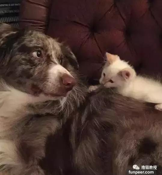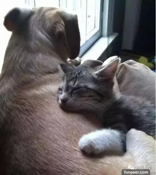 其實,小貓和大狗之間溫馨的故事還很多,一大一小,和諧的畫面看起來特別溫暖。小小貓,以後狗哥罩著你。▼
