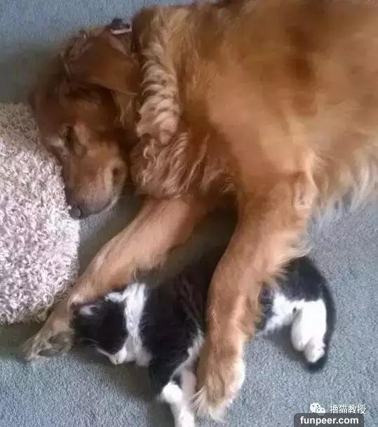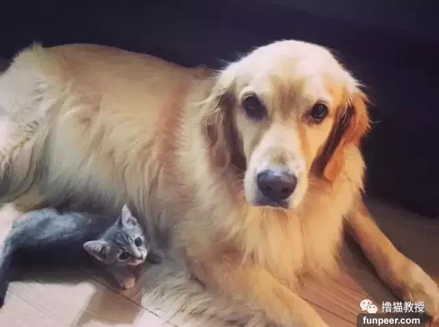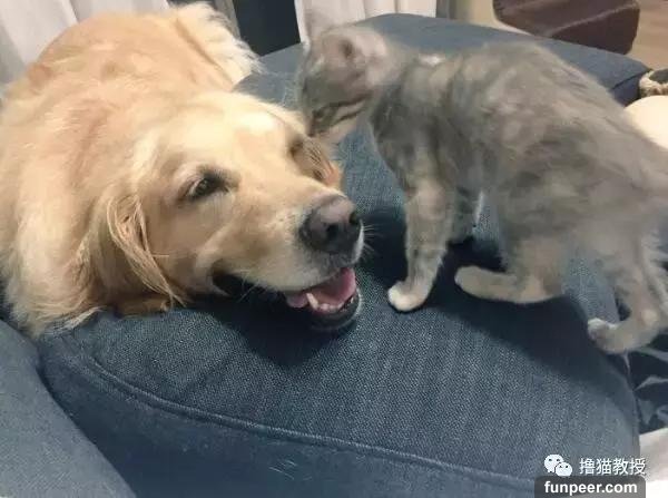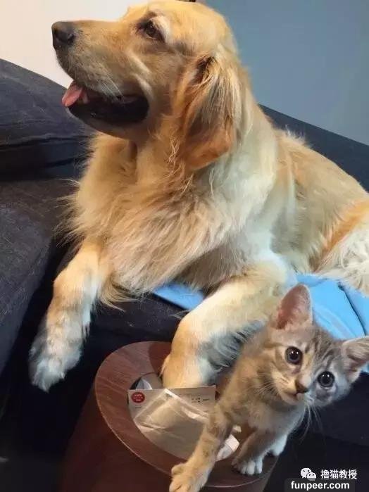 大大的狗和小小的貓在一起,金毛也特別寵小貓,來,我們親親吧。▼