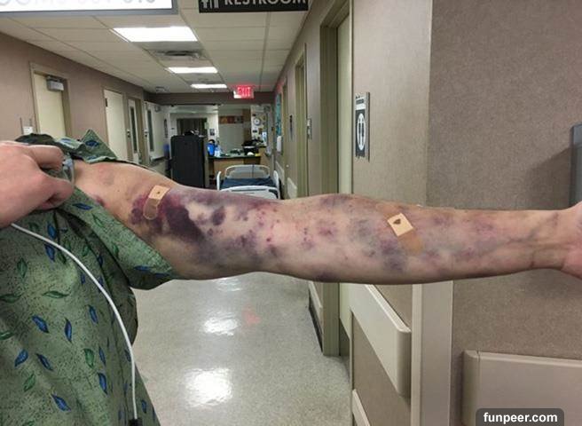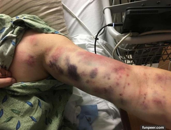 才過沒幾小時,他的手臂竟然出現一塊一塊的瘀青,而且疼痛到無法忍受!傑伊的老婆在擔憂之下,馬上送他到醫院治療,沒想到醫生檢查後竟然查不出病因,根本不知道他是被什麼蟲咬傷,也不知道為什麼會出現這樣的症狀!![]()