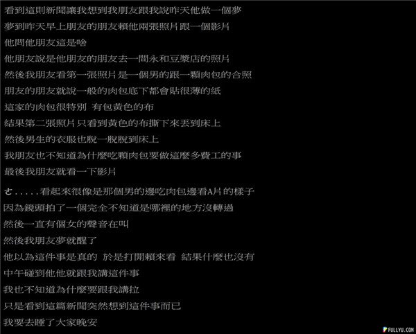 事件曝光後,很快有網友在PTT八卦板回文表示,「夢到」朋友收到2張照片和1支影片,第1張照片就是「包著黃色布」肉包和1名男生合照,另一張是肉包原本身上的「黃色布」已被丟到床上,而男生的衣服也散落在床上。