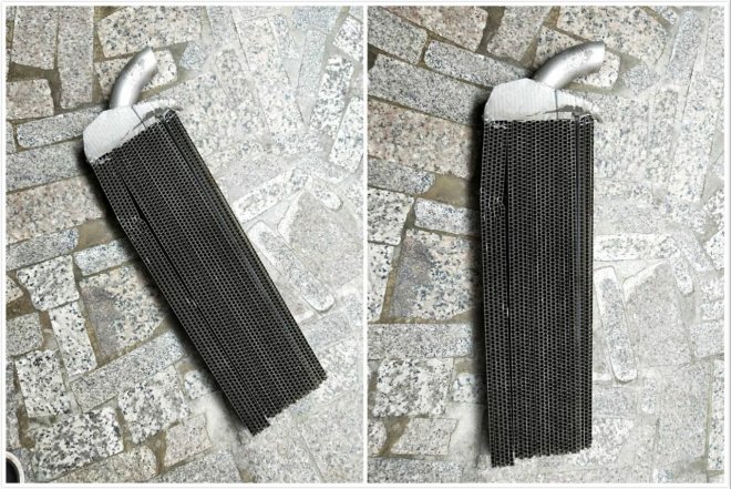 拆下來竟然是瓦愣板組成⋯再噴銀漆⋯再黏鐵管⋯好精緻啊!這是以後要燒的嗎?」沒想到老公說得沒錯,這真的是「紙糊的」沒錯啊!
