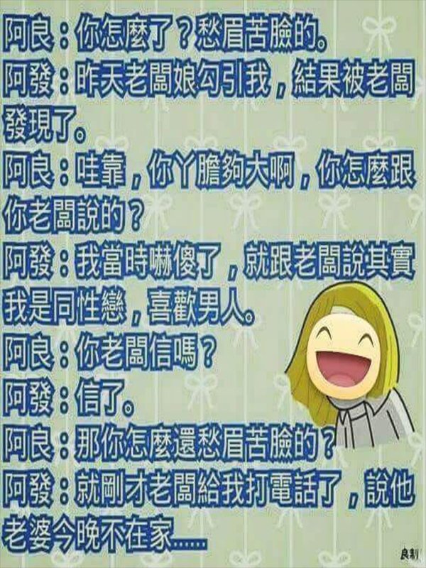 阿良一早就愁眉苦臉的跟我說,昨天被老闆發現老闆娘在勾引他?!