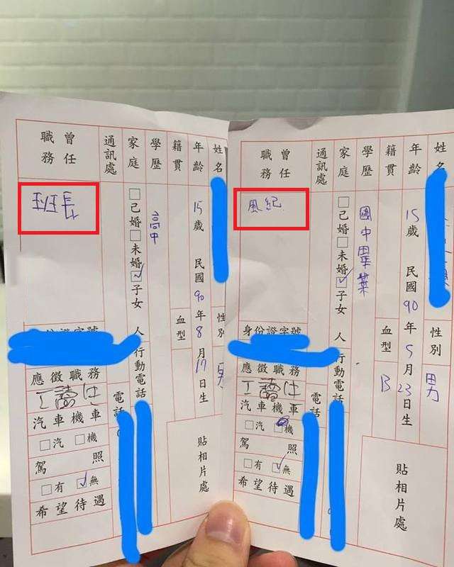 透過照片可以看到,兩張履歷表的求職者都是15歲,推測應該是國中生畢業後的暑期打工應徵,
