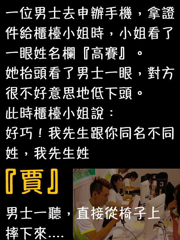 一位男士去申辦手機時因為自己的名字而不敢抬頭,幸虧櫃檯小姐的機智化解了這場尷尬?