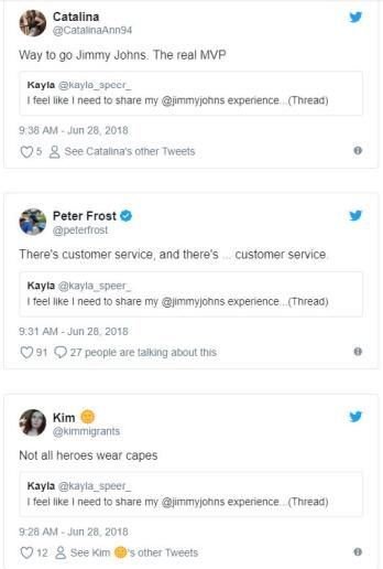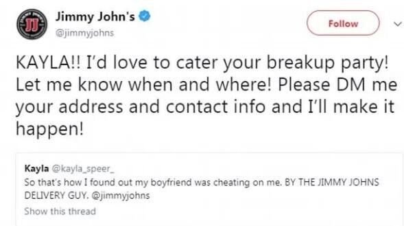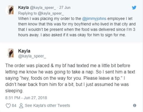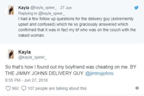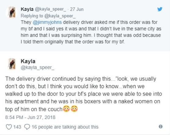 事後兩人分手收場,凱拉把這段故事PO到推特上,並tag了該家餐飲店,表示多虧了外送員才讓她發現男友劈腿。