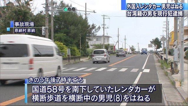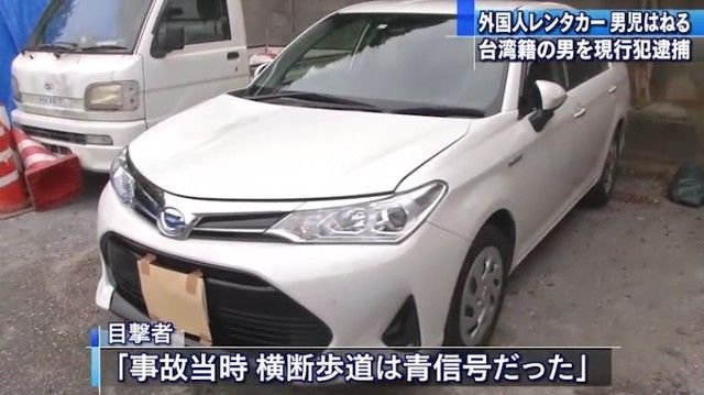 《琉球朝日放送》報導,在11日晚上七點,一名台灣籍的男子,開著租車自駕遊沖繩的時候,在恩納國道58號南下路段,衝撞正在過斑馬線的小學八歲男童,造成男童頭部重創、肋骨斷裂,重傷送醫。