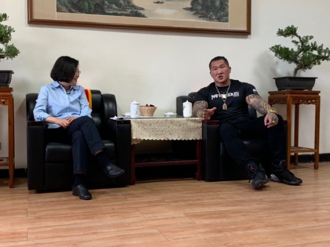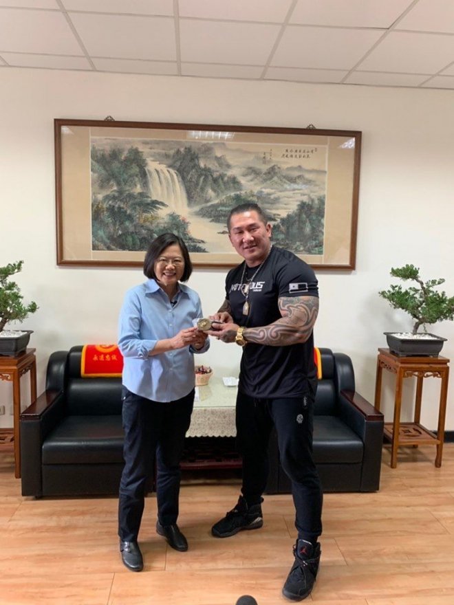 兩個人的合照更凸顯館長有多大隻,光那隻上手臂的二頭肌,就比總統蔡英文的頭還要大顆!莫名出現反差萌XDDD