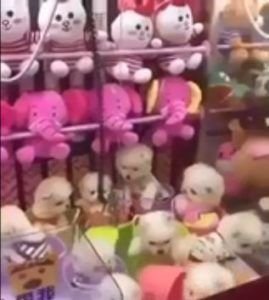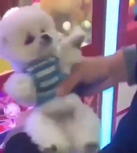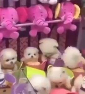 目測有10隻毛茸茸的小狗狗,全擠在機台裡。然後下秒大金屬夾子降下,並向小狗狗不斷抓取。