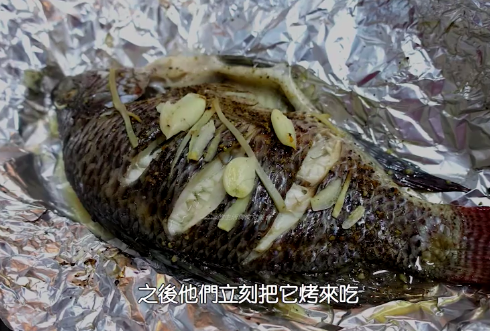 終於在黃昏時刻,他們釣到了一尾重約4公斤的吳郭魚,5人立刻開心將吳郭魚煮熟分食…