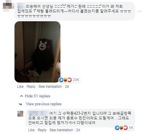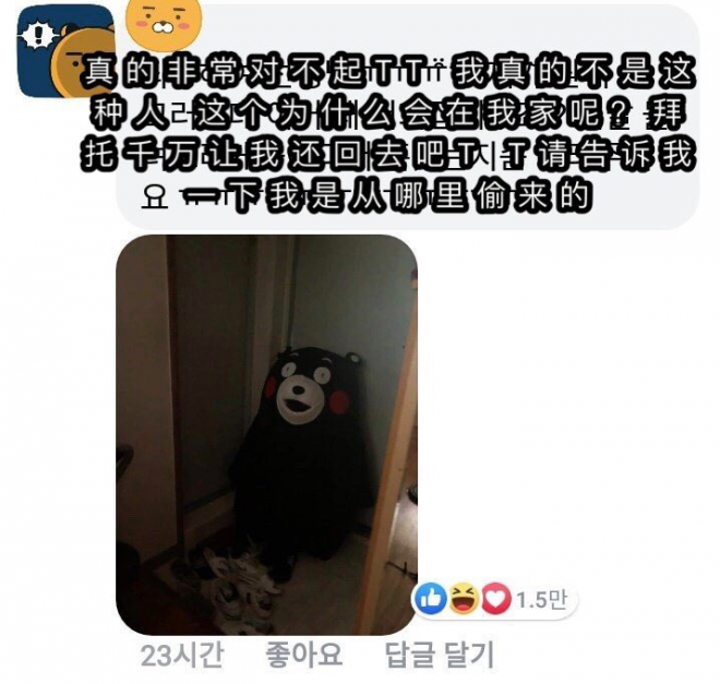 原文貼於韓國FB專頁「구리시 대신전해드립니다」,店主託該專頁幫忙尋人,希望當事人歸還「熊本熊」,附上了一張「熊本熊」舉高雙手跑走的照片,可愛模樣引起網民爆笑,單篇貼文就超過7萬網民回應,後來更被轉載到微博。