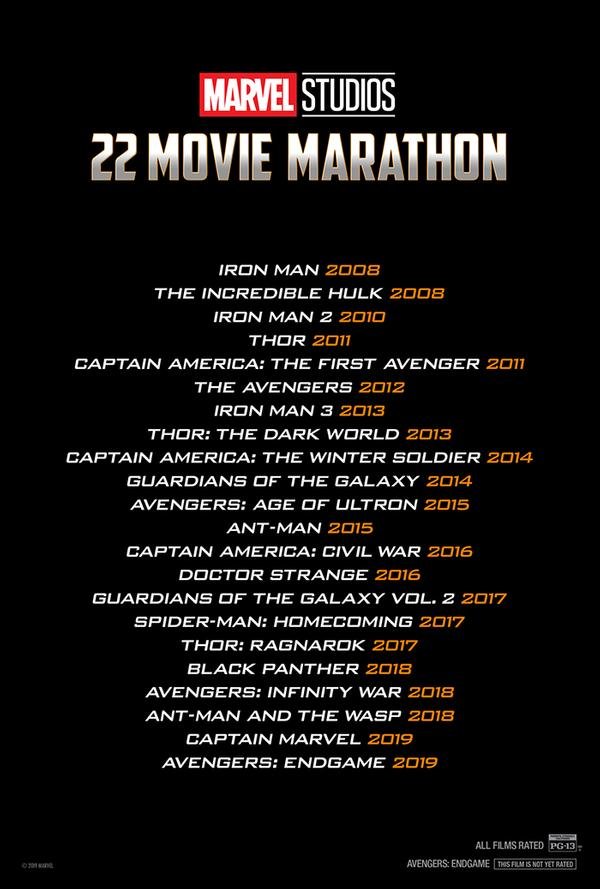 ▼還記得在上個月底《復仇者聯盟 4》上映前夕,美國知名的大型連鎖電影院 AMC 就曾舉辦「」,也就是將總共 11 年漫威電影宇宙的 22 部電影毫不間斷、全部一口氣播出!許多居住在美國的漫威粉絲親身去體驗了從 4 月 23 日第一部《鋼鐵人》看起,一路撐到 4 月 25 日《復仇者聯盟 4 : 終局之戰》上映之時觀看最新大作,成為不少人最酷炫、也最疲憊的 MCU 觀影體驗。