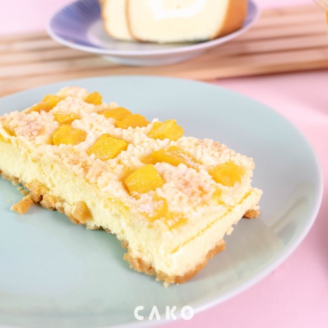 以蒸烤工法保留輕乳酪蛋糕的綿細濕潤口感,內層夾餡以起士慕斯和芒果慕斯雙慕斯的綜合口感,並加以台灣芒果爽快夾入兩餡中間,乳香果酸一口滿足。