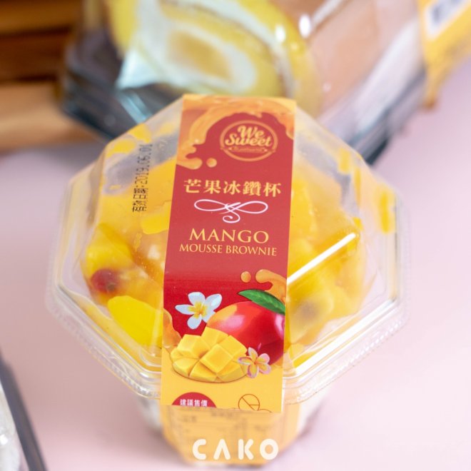 使用台灣新鮮愛文芒果製作,巧克力布朗尼為基底,搭配清爽優格慕斯與芒果慕斯,淋上芒果醬後以酥脆杏仁角點綴,從濃郁至清爽的層次,令人驚艷的南國夏日美味。