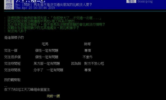 後來女生就沒聯絡了,讓他不禁納悶,「是不是男生沒戀愛經驗的會比較沒行情啊?反觀女生好像經驗少的尤其是處女,就比較搶手?有沒有八卦?」