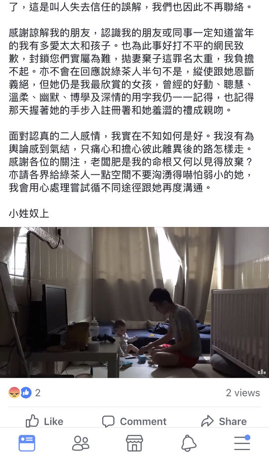 面對網上這麼激烈的聲討,小姓奴在他的Facebook 上發表千字文回應,承認婚前和多名粉絲發生關係,並且回應整件事男方的看法。