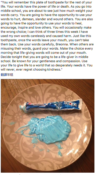 妳這輩子都要記得這一盤牙膏,因為你說出的話就像這一盤牙膏一樣,說出去後就再也無法收回。」女兒恍然大悟