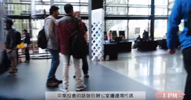 10:30-11am 開晨會.每個小組圍成一個小圈圈會報一下昨天的工作進展和今天的規劃。在家工作的人可以視訊