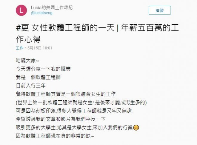 她是軟體工程師,入行3年,軟體工程師其實是一個很適合女生的工作,一般人刻板印象,覺得工程師就是又宅又無趣,希望來平反。
