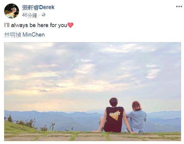 其實之前張軒睿已經喺fb疑似認愛!po咗一張佢同林明禎嘅背影合照,寫上「I’ll always be here for you.」,tag埋林明禎!貼文曝光後,引起熱議,好友溫貞菱首先留言「不用仰起頭,也能看見天空」,林心如也回應「勇敢的向前吧」,而章廣辰則回應:「喜歡你暖暖的文字,洋溢著滿滿的幸福」,這些話疑似表達祝福。