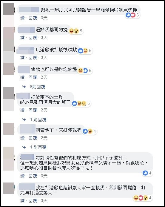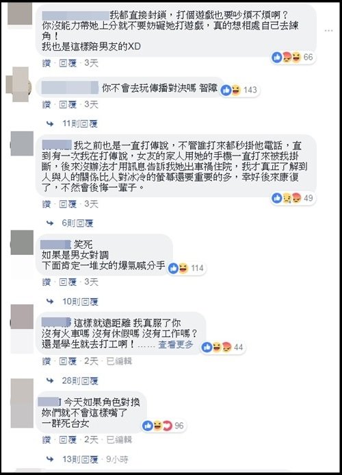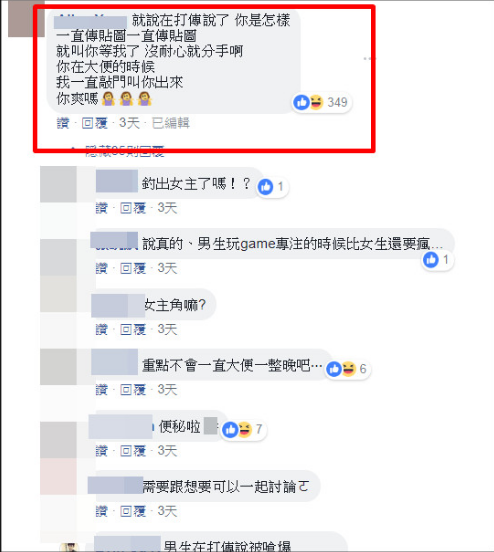 沒想到男友的PO文,居然意外釣出女友本人反嗆,女友留言「就說在打傳說了,你是怎樣,一直傳貼圖一直傳貼圖,就叫你等我了,沒耐心就分手啊,你在大便的時候,我一直敲門叫你出來,你爽嗎?」