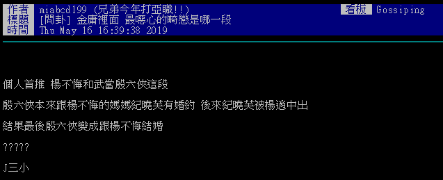 就有一位網友在批踢踢上問掛,「金庸裡面 最噁心的畸戀是哪一段?」