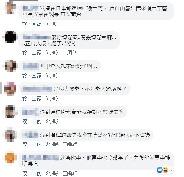 貼文曝光後引起討論,其他網友留言回應:「直接問有需要棺材還是塔位嗎」、「台灣最不缺的就是這種老人」、「跟她說廁所有馬桶可以坐」、「算了,她仗著有年紀了,怎麼說妳都贏不了」、「有些老人家讓人很難同情啊」、「幫腔的中年女怎麼不發揮她的愛心呢」,也有不少認為應該取消博愛座,「真心覺得要廢除博愛座」、「博愛座,其實真的不需要,有愛心的人還是會讓出來」。
