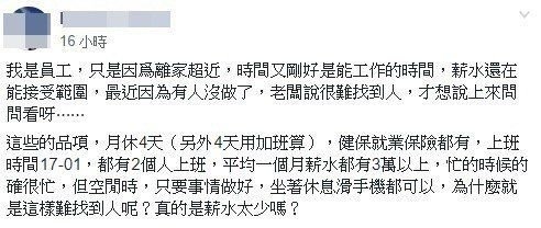 月休4天(另外4天用加班算),健保就業保險都有,只要把工作做好,就可以坐下休息滑手機,不禁想問「為什麼就是這樣難找到人呢?真的是薪水太少嗎?」