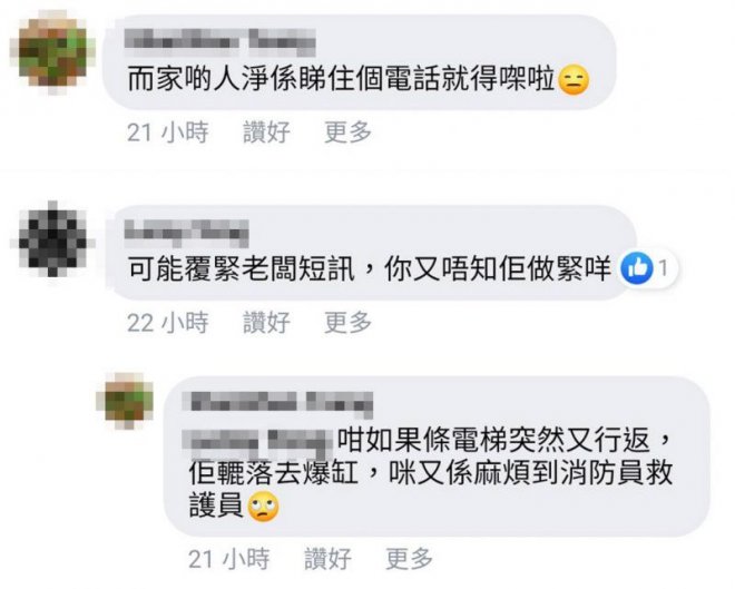 網民強力恥笑網民討論十分熱烈,有些還很有求真精神!有人研究電梯是否突然停止運作,有人研究他是否在趕緊回覆老闆的短訊,還是在「打機」中,亦有人擔心他會在電梯恢復運作時滾下去,要勞煩消防員救人,更有人斥責他行為不當,不過最多的還是盡情地恥笑。
