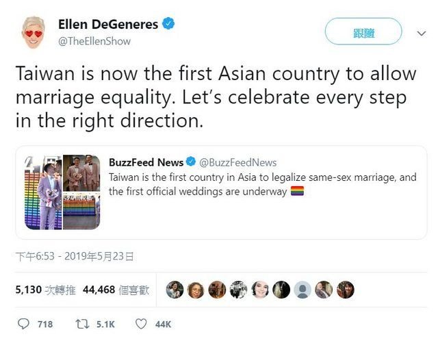 也特別在推特恭喜台灣成為亞洲第一個同婚合法的「國家」,間接從同婚讓大家認識台灣