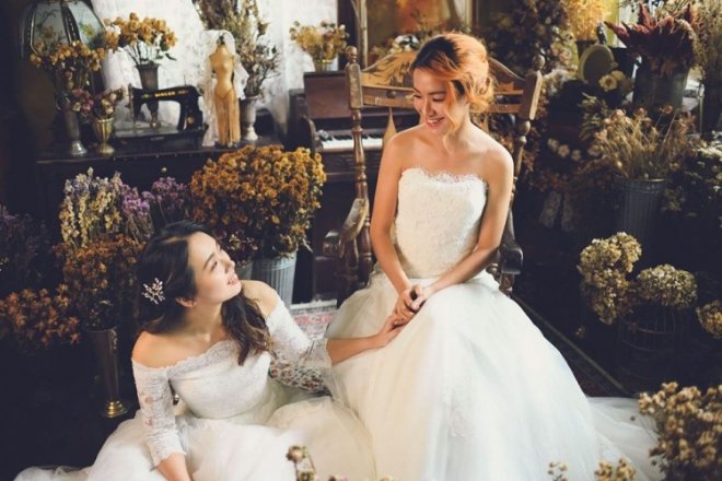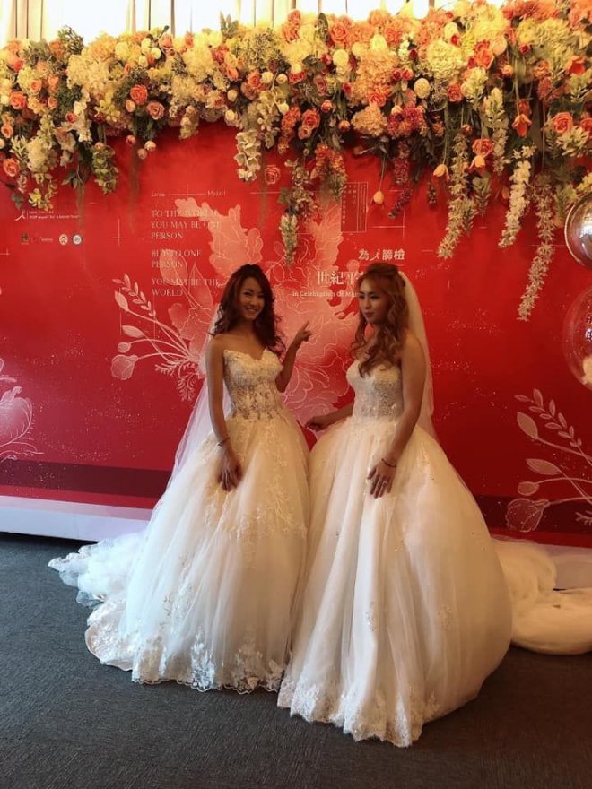小倆口還接受採訪,但醉翁之意不在酒,因為大票人在意的是這對拉拉高顏值啊! *註解:拉拉為近二十年漢語圈出現「女同志」、「蕾絲邊」名稱。