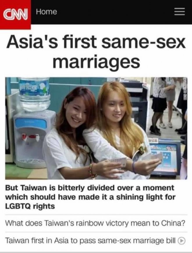 話說上禮拜五(17日)同志婚姻法案,以亞洲第一、三讀通過,這堪稱台灣歷史來最快通過法案,讓大票同志感動落淚,並搶著去結婚,戶政事務所超溫馨。但神奇的是當天性別結婚比例,女生是男生5倍欸XD。台灣有名的拉拉 YouTuber BBdiary正到登上CNN首頁頭版。